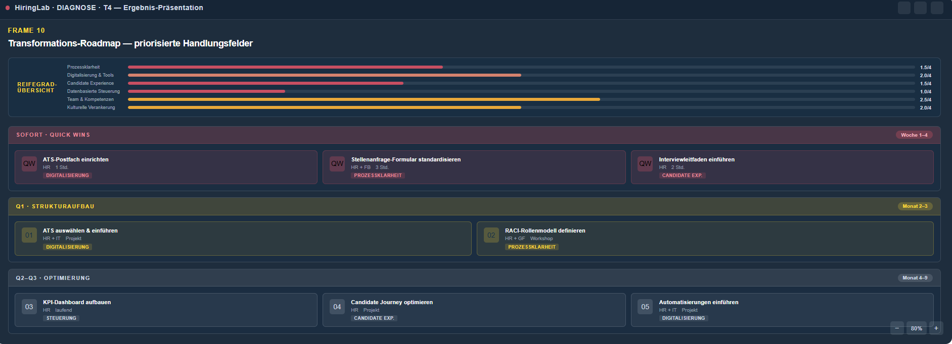 Die Diagnose liefert Ihnen ein klares Bild: Die Reifegradanalyse umfasst sechs Dimensionen, von der Prozessklarheit und Rollenverteilung bis hin zur Candidate Experience und datenbasierten Steuerung. Sie erhalten konkrete Quick Wins, die sofort entlasten..