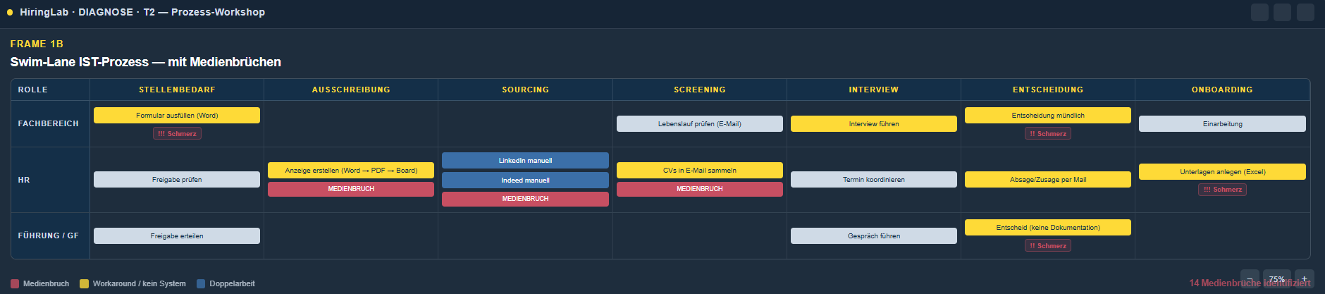 Ergebnis aus einer Recruiting-Diagnose: Swim-Lane-Prozessmap mit identifizierten Medienbrüchen.