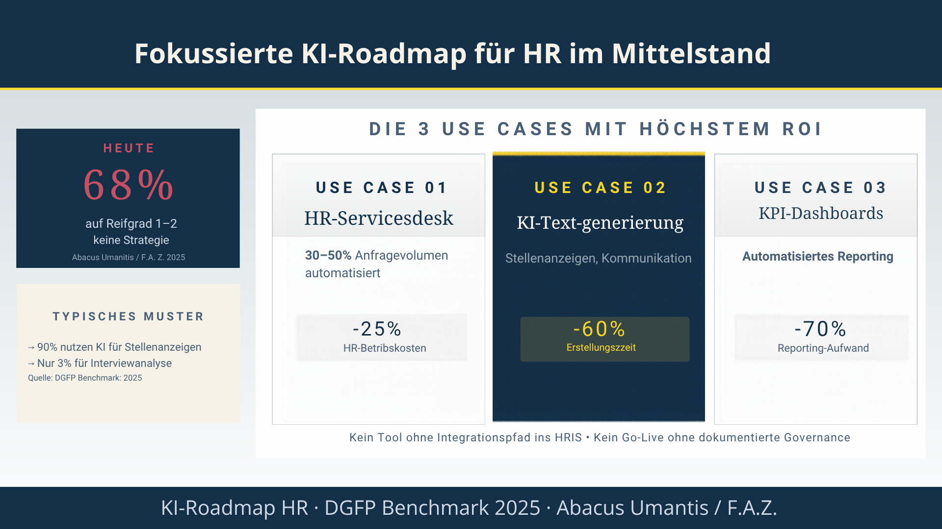 68 Prozent der mittelständischen HR-Abteilungen befinden sich beim KI-Einsatz auf Reifegrad 1 oder 2: Tools sind im Einsatz, es gibt jedoch keine Strategie, keine Wirkungsmessung und keine Governance. Der Sprung auf Stufe 3 scheitert in 54 Prozent der Fälle an fehlender IT-Integration und in 41 Prozent der Fälle an unklarer Verantwortlichkeit.